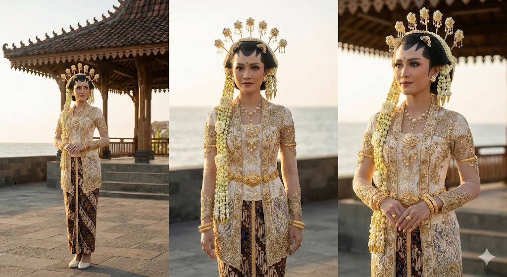 | Ciri Khas | Kebaya panjang, rambut simetris | Sanggul Priangan dengan mangle | Mahkota Siger di kepala |